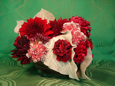 She is doing a series for “first fridays” at the Natural History Museum this spring. This piece, relating to the use of tools, will be shown in March. The materials are battle axes, dendrobium orchids, and purple carnations. Fierce!