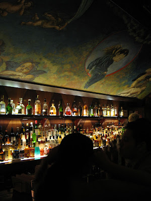 Alex and I are doing business in New York this weekend but finding time for some pleasure too. Like having drinks with Sasha Bezzubov and Jessica Sucher at Angel’s Share, my favorite bar in Manhattan. It’s so incredibly cozy and cool. They have a 4 person maximum per table, which at first I thought was lame and now I think is completely civilized and fabulous. I love the mural of the angels above the bar (above) and the wood paneled lounge (below).