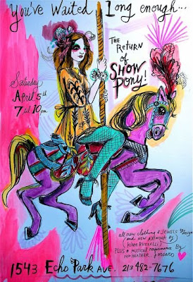So excited for the return of Show Pony tonight in Echo Park. Owner Kime Buzzelli is all about feathers, beads, thrift store, sequins, suede – you get the idea. Her store is completely inspired.