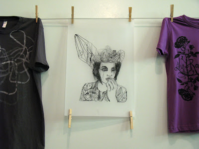 A group of LA-based artists (including Kime Buzzelli and Frohawk Two Feathers ) participated in a live event in Los Feliz last night, screening their artwork onto t-shirts for eager fans. My favorite designs were Frohawk’s feathers and Kime’s lady (see below).