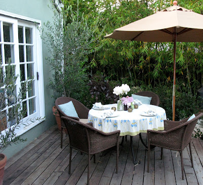 All summer long we eat outside in the “dining room” portion of our deck. I love decorating the table with Provencal linens from Lavender Blue, a beautiful linen boutique run out of the home of Catherine Giraud here in L.A.