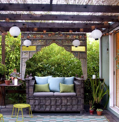 Below is my favorite part of the deck. Accessible from our bedroom though french doors, this really functions as our outdoor living room. The Moroccan-style couch came with the house and this interesting carved headboard was sitting behind the garage when we moved in. My friend and landscape designer Tory Polone suggested we hang it above the couch to create a cozy little nook.