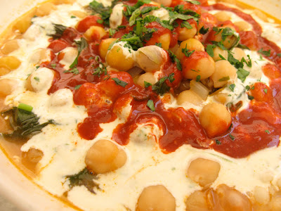 Chickpea stew with greens, cous cous, spiced yogurt & harissa…ooh la la.