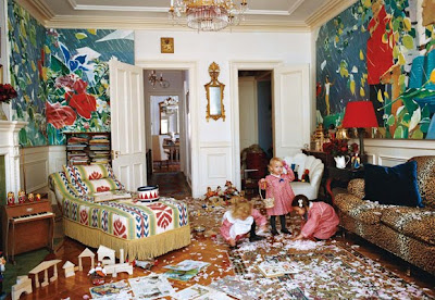 The Brooklyn home of textile designer Olya Thompson is the subject of a gorgeous story in the January issue of Vogue and I truly love what I see here. Let’s start with Olya in vintage Geoffrey Beene above. Love. Flocked by children in vivid blue dresses. Love.
