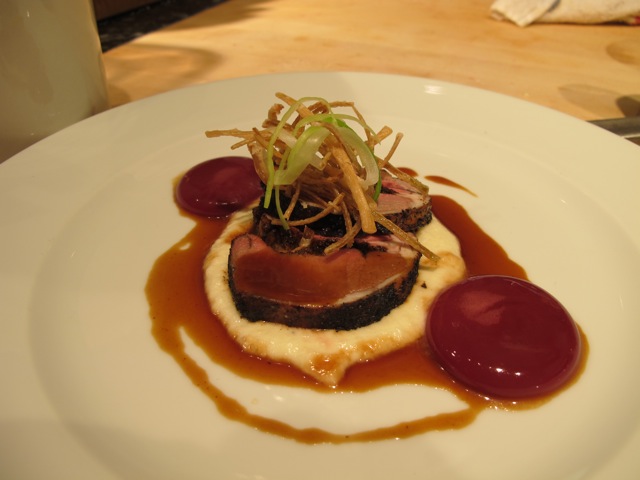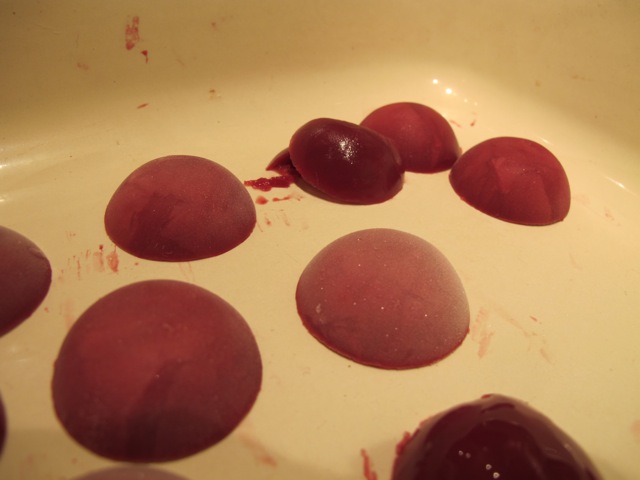 We also made Coffee Rubed Lamb Loin, served with Rocky Mountain Wildberry Spheres. The lamb was the delicious (the rub contained ground coffee beans, brown sugar, chili powder, paprika, onion powder, ground sage and cayenne and was literally bursting with flavor) and the spheres were….spherical.