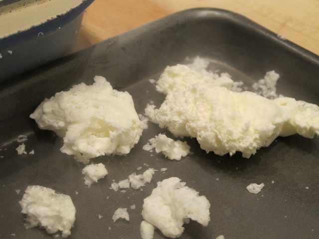 The idea is to break food down and then reconstitute it in a different form. “Parmesan Air” is a perfect example. We combined water and parm, heated the mixture, strained it and let it stand for 30 minutes (above). A dash of Lecite, a trip to the freezer and a blast of liquid nitrogen later and voila! Parmesan Air! It’s quite pretty, no?