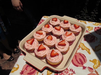 The fourth annual No Cookie Left Behind bake sale took place yesterday and thanks to all who donated, baked, blogged and showed up for sweets, we raised lots of $$$$ for Share Our Strength. People really did it up and made some incredible things, like Amelia, for example, who showed up with a platter of Banana Cupcakes with Maple Brown Butter Icing. And Jeana with her super cute Strawberry Cupcakes. Intensely delicious, I tell ya.
