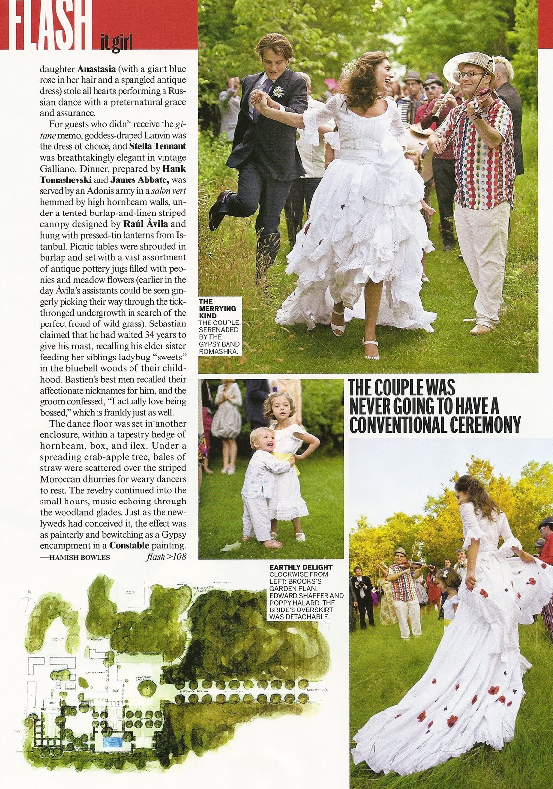 That is until the day, several weeks ago, when I received my August issue of Vogue in the mail and opened it up to page 98. Here, I stumbled upon a photo shoot picturing the nuptials of landscaper designer Miranda Brooks. Hello custom Oscar dress. Hello garden setting. Hello drama.